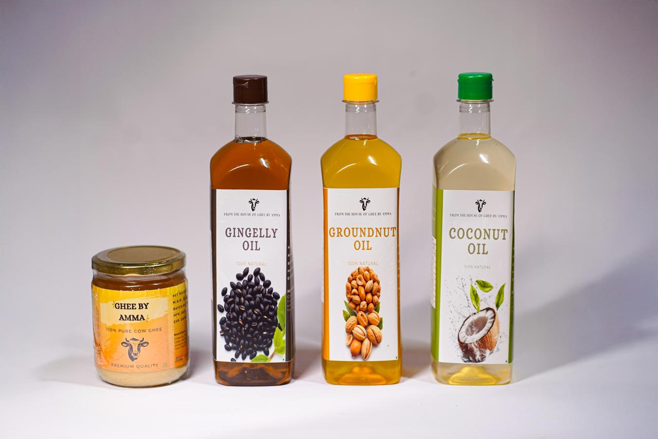 500ml Groundnut Oil + 500ml Coconut Oil + 500ml Gingelly Oil + 250ml Ghee